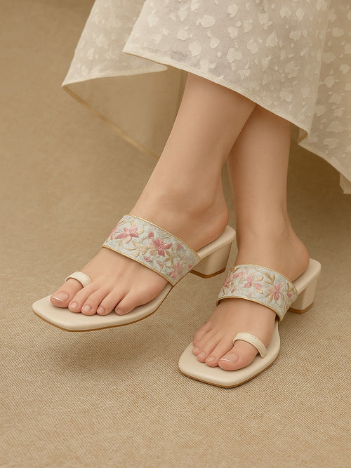 Elegant Floral Embroidered Block Heel Toe-Ring Sandals (Beige)
